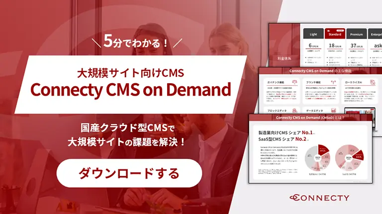 大規模サイト向け国産クラウドCMS「Connecty CMS on Demand」の紹介資料です。大規模サイト特有の課題に対し、本CMSが持つ強固なセキュリティやガバナンス機能、効率的なコンテンツ管理機能によってどう解決するかがわかります。